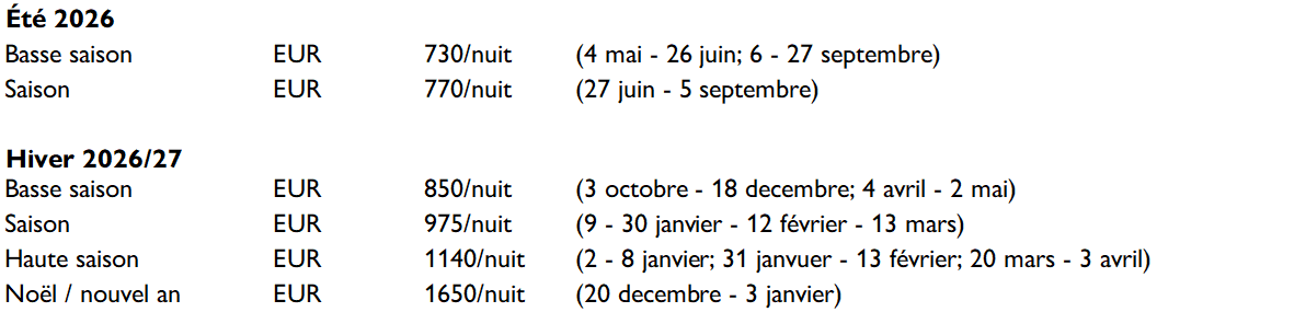 Les réservations d'une semaine ou plus bénéficient d’une réduction de 10%, les séjours de 12 nuits ou plus d’une réduction de 20%, sur les prix indiqué ci-dessus. Pour les réservations courtes de 3 nuits il y a un supplément de 20% et de 33% pour les séjours de 2 nuits.